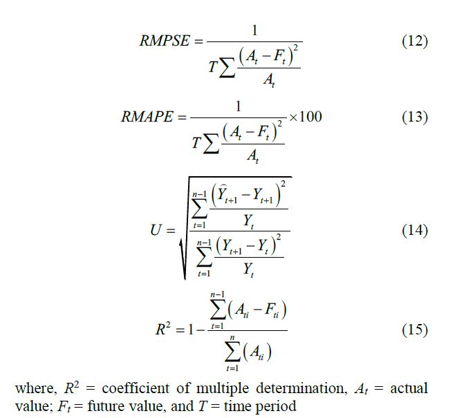 For measuring the accuracy in fitted time series model, mean absolute prediction error (MAPE), relative mean square prediction error (RMSPE), relative mean absolute prediction error (RMAPE) [4], Theil’s U statistic and R2 were computed using the following formulae: