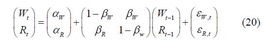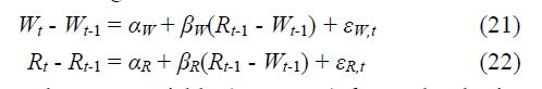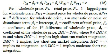 where, Wt is the monthly wholesale price at the ith period, Rt is the monthly retail price at the ith period, αW and αR reflect the constant secular trend in wholesale and retail markets respectively. The βW and βR reflect the influence of lagged price from one market on the current price in the other market. In the GS framework, the estimated equations are given as:
