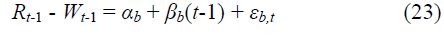 Here, the explanatory variable (Rt-1 - Wt-1) forms the ‘basis’ that is the difference between the wholesale and retail prices. The ‘basis’ variable should reflect the cost of capital from the trading date till expiry date and should contain a negative time trend, i.e.