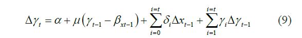The VECM explains the difference in yt and yt-1 (i.e. Δyt) and it is shown below [7] [8]: