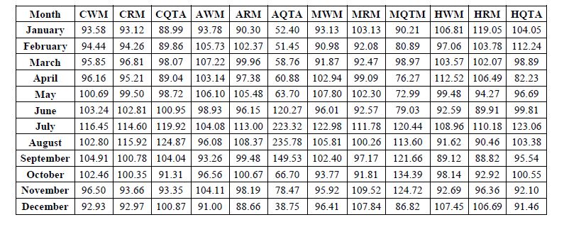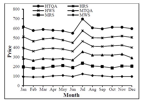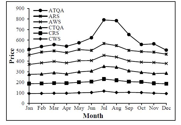 A cursory review of the results of the seasonal price index pattern showed that in all the selected markets the price of banana was at its peak in the month of July when the quantity of arrivals was highest while the prices and their corresponding quantity of arrivals were found to be at the EBB during February (Table.2 and Fig.1 and Fig.2).