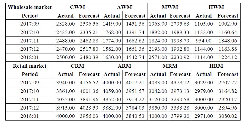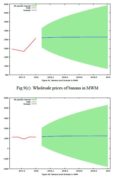 One step ahead out of sample forecast for banana prices (Rupees per quintal) for the wholesale and retail markets from February 2018 to January 2019 were computed. This short span prediction was made in order not to affect market efficiency as long prediction will attract investors which will lead to the breakdown of the forecasted price (Table.17 and Fig.9 and Fig.10).