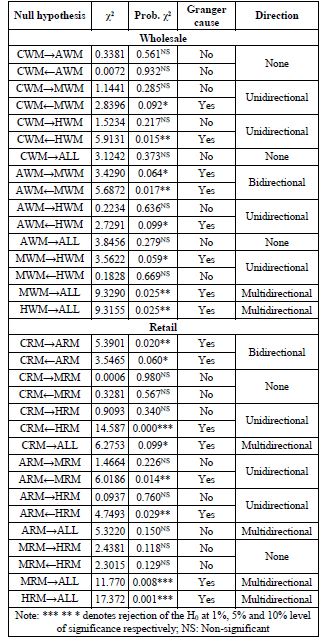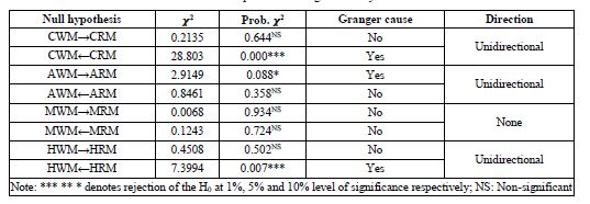 The results of the direction of price information flow for the horizontal and retail market pair-wise showed that market pair viz. AWM-MWM; MWM-CWM, MWM-HWM, HWM-CWM; and, CWM-AWM had bidirectional causality, unidirectional causality and no causal relation respectively; while, CRS-ARS; MRS-ARS, HRS-CRS and HRS-ARS; and, CRS-MRS and MRS-HRS had bidirectional causality, unidirectional causality and no causality respectively (Table.10). The bidirectional causality implies that the market pair reciprocates price transmission as there is feed forward and feed backward in price formation. In the case of unidirectional causality, only one market in the pair dominates in price formation as its price effect is transmitted to later whereas the effect of price change in the later in the pair is not felt by the former. For the market pair with non-causal relation, it implies that the markets in the pair are independent of each other in price formation as none of the markets in the pair determines the price in each other market. In this case, external influence plays the crucial role in price formation in markets with no Granger causality effect.