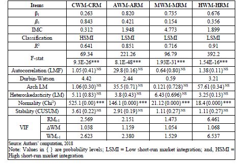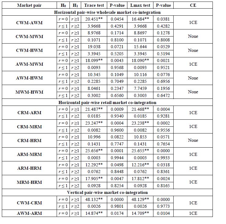 The presence of two common stochastic trends (hence two independent markets) and one common stochastic trend for wholesale and retail markets respectively implies the presence of pair-wise cointegation of prices. For the horizontal pair-wise wholesale market co-integration results, with the exception of the market pairs viz. CWM-AWM and AWM-MWM which move together in the long-run, all the remaining market pairs have no long-run association. In the case of the retail market in the pair at the same level, with the exception of CRM-HRM, all the markets shared the same or have one stochastic trend, an indication that price differential between the markets in the pair are equal to the cost of transfer of banana despite their geographical spatiality’s (Table.6). Furthermore, the vertical pair-wise market co-integration results showed that all the wholesale markets to be integrated with their respective adjunct retail markets an indication of vertical market integration as the price differentials between the wholesale markets and their respective retail markets were equal to the cost of transfer of banana fruit. This outcome showed efficiency in the mechanism of banana marketing across the marketing channel which is due to a perfect flow of information, adequate market infrastructure and adequate quantity of arrivals (Table.6).