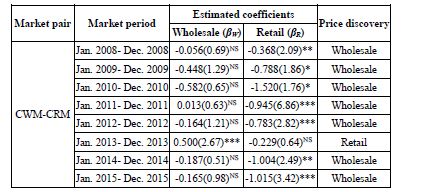 The ‘basis’ was regressed for each time period, on a time variable (t-1), where t was the time to maturity of the retail market time period; and it was found that the estimated coefficient on time trend (βb) had turned negative, as expected. In the GS framework, Eq.(21) to Eq.(23) were estimated using ‘seemingly unrelated regression’ (SUR) model. If the estimated coefficient of βW is significant and βR is insignificant, the price discovery occurs only in the retail market. This would imply that the retail market is a pure satellite of the wholesale market and there is a convergence of wholesale and retail market prices because retail market prices move towards wholesale market prices. If βR is significant and βW is insignificant, price discovery occurs only in the wholesale market. If both βW and βR are significant, price discovery occurs in both the markets. If βR > βW, wholesale market dominates the retail market, and if βW > βR, retail market dominates the wholesale market. If both βW and βR are insignificant, then price discovery did not occur in either of the markets.