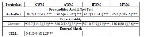 where, Yt is the price in the ith period of the ith market, p is the order of the GARCH term and q is the order of the ARCH term. The sum of ARCH and GARCH (α+β) gives the degree of persistence of volatility in the series. The closer is the sum to 1; the greater is the tendency of volatility to persist for a longer time. If the sum exceeds 1, it is indicative of an explosive series with a tendency to meander away from the mean value