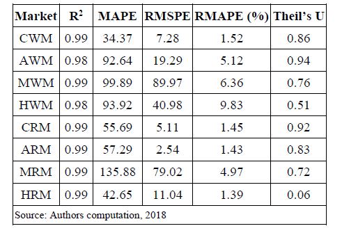 The price forecasting ability of the wholesale and retail market prices was measured using the mean absolute prediction error (MAPE), root mean square error (RMSE), Theil’s inequality coefficient (U) and the relative mean absolute prediction error (RMAPE) (Table.16). The results indicated the accuracy of the price forecasted as shown by their respective market RMAPE and U which were less than 10% and equal to 1 respectively. Therefore, these relatively low values indicated the consistency of the forecasted prices with the actual prices.