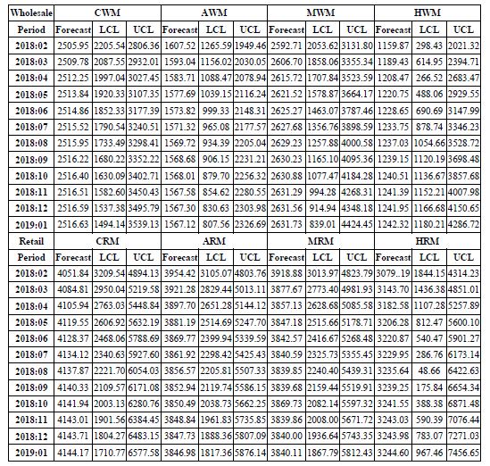 It was observed that CWM, MWM and HWM markets will witness a very slight increase in their respective prices till the early month of their last quarter and thereafter will flatten out after a gentle very slight fall in the prices. The price of the banana in AWM will be oscillating throughout the month range from February to September 2018, remain flat till October and thereafter a slight fall which will flatten-out till January 2019. In the case of the retail markets, the retail prices of CRM, ARM and HRM will exhibit an oscillating (upward-downward swing) trend throughout the forecasted periods whereas the retail prices in MRM will witness an oscillating behaviour till July 2018, then a slight decline which will flatten-out till November 2018 and thereafter a slight increase which will maintain a flat trend till January 2019. The rate of price instability across all the markets will be mild as observed from their respective standard error values (not reported). Therefore, the technical and pricing efficiencies of banana should be monitored in such a way that neither the farmer nor the consumer nay the middlemen will be better-off nor worse-off in the marketing channel of banana in India.