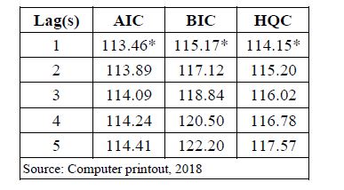 Because of the sensitivity of the time series to lag length, the chosen lag for truncation that will make the model parsimoniously and ensure that the error term is Gaussian white noise is lag 1 as unanimously agreed by all the selection criteria viz. Akaike information criterion (AIC), Hannan-Quinn information criterion (HIC) and Bayesian information criterion (BIC) as indicated by their respective asterisk sign (Table.3).