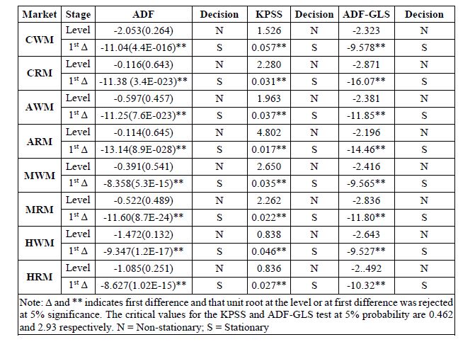 The results of the ADF unit root test showed both the wholesale and retail price series not to be stationary at their respective levels (estimated tau-stats greater than t-critical values at 5% degree of freedom) but were found to be stationary at their respective first difference (estimated tau-stats less than t-critical values at 5% probability level). Also, the KPSS unit root test rejected the null hypothesis of absence of unit root in favour of alternative hypothesis of presence of unit root at level for all the variable price series (t-stats greater than the t-critical value at 5% risk level) but after the first difference the test accepted the null hypothesis of absence of random walk in the residuals of each of the variable price series against their alternative hypothesis of non-stationary (t-stats less than the t-critical value at 5% risk level). Furthermore, the ADF-GLS unit root test applied at the level to all the price series indicated non-stationary of the price series but after first difference they became stationary, thus, implying that the unit root test results generated by the conventional or traditional unit root techniques were robust (Table.4). Therefore, since both the wholesale and retail price series satisfied the pre-requisite for the application of cointegration test as their respective variable series are integrated of order one [I(1)].