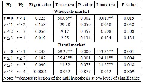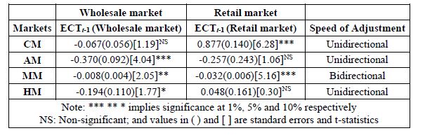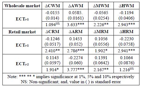 The multivariate horizontal-wise VECM results for wholesale and retail markets showed that markets viz. AWM, MWM and HWM; and, all the retail markets respectively established long-run equilibrium irrespective of any short-run shock that emanated from any of the markets as evidenced by the significance of their respective attractor coefficients (Table.7). With the exception of AWM and MRM which diverge from the equilibrium, all the other markets converge to the equilibrium as indicated by the signs of their respective attractor coefficients (ECTt-1). Therefore, wholesale markets AWM, MWM and HWM; and retail markets CRM, ARM, MRM and HRM absorbed 5.9%, 5.7% and 11.93%; and, 12.46%, 14.53%, 10.56% and 22.30% shocks respectively to bring about price equilibrium in the long-run. The time required for information flow in the wholesale and retail markets were very fast as it will take approximately 1.77 days, 1.71 days and 3 days in AWM, MWM, and HWM respectively; and, 3.74 days, 4.36 days, 3.17 days and 6.70 days in CRM, ARM, MRM and HRM respectively, as indicated by their respective magnitude coefficients. Therefore, the MWM and MRM among the wholesale and retail markets were the most efficient in terms of reaction to the news on price.
