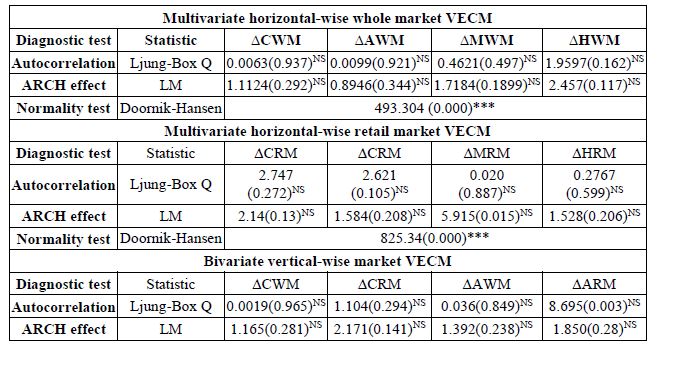 The results of the vertically integrated markets showed that only the vertical integrated market in Mumbai reciprocate in terms of reaction to news on price as evidenced by the significance of the attractor coefficients of the wholesale and its adjunct retail market (Table.8). Hence, the wholesale market is more efficient than the retail market in responding to price news as it will take less than an hour in a month in the former to re-established long-run price equilibrium when compared to the later which required almost an hour in a month to correct its disequilibria. For the markets in Chennai; and, Ahmadabad and Hyderabad the speed of price flow was unidirectional as only their respective retail and wholesale markets respectively were found to correct their deviation from the equilibrium due to any available price news shocks from the short-run equilibrium. For the markets which established long-run equilibrium, markets viz. AWM, MWM, HWM converges to their respective equilibrium while CRM diverges from its respective equilibrium. The autocorrelation and arch effect test for all the bivariate vertically integrated VECM exonerated their residuals from the problem of serial correlation and auto-covariance as evidenced by their respective Ljung-Box Q-stats and Lagrange multiplier test stats which were not different from zero at 10% probability level. However, their respective residuals failed the test of normality, but non-normality is not considered a serious problem as data in most cases are not normally distributed (Table.9).